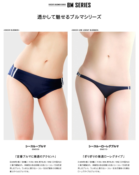 うっすらとお肌が見えるシースルー生地が羞恥心を煽る定番スタイルのブルマです。