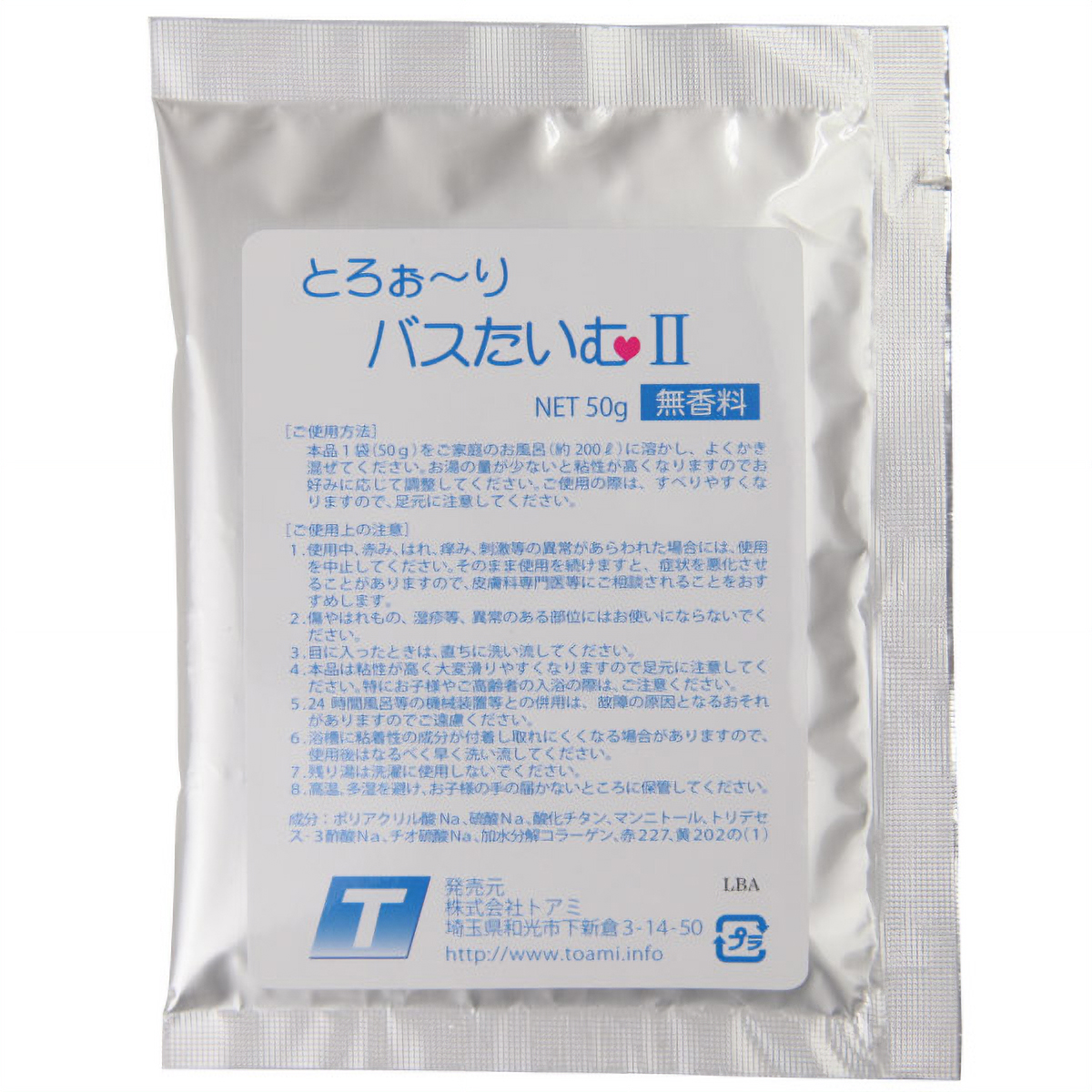 自宅のお風呂で、ぷるぷるお肌に!とろとろスベスベのエステ風呂が体験できるバスグッズ。1袋(50g)を一般的な浴槽のお湯(約200リットル)に溶かすだけで、ピンク色のトロトロお風呂に変身!お湯の量を調節すれば、お好みの粘度で楽しめます。お肌に潤いを与えてくれる、加水分解コラーゲンを配合!さらに、使いやすい無香料なのも嬉しいポイント!いつものバスタイムが楽しくなる入浴剤です。※溶けにくい場合は、高温のお湯で溶かしてから浴槽へ入れて下さい。