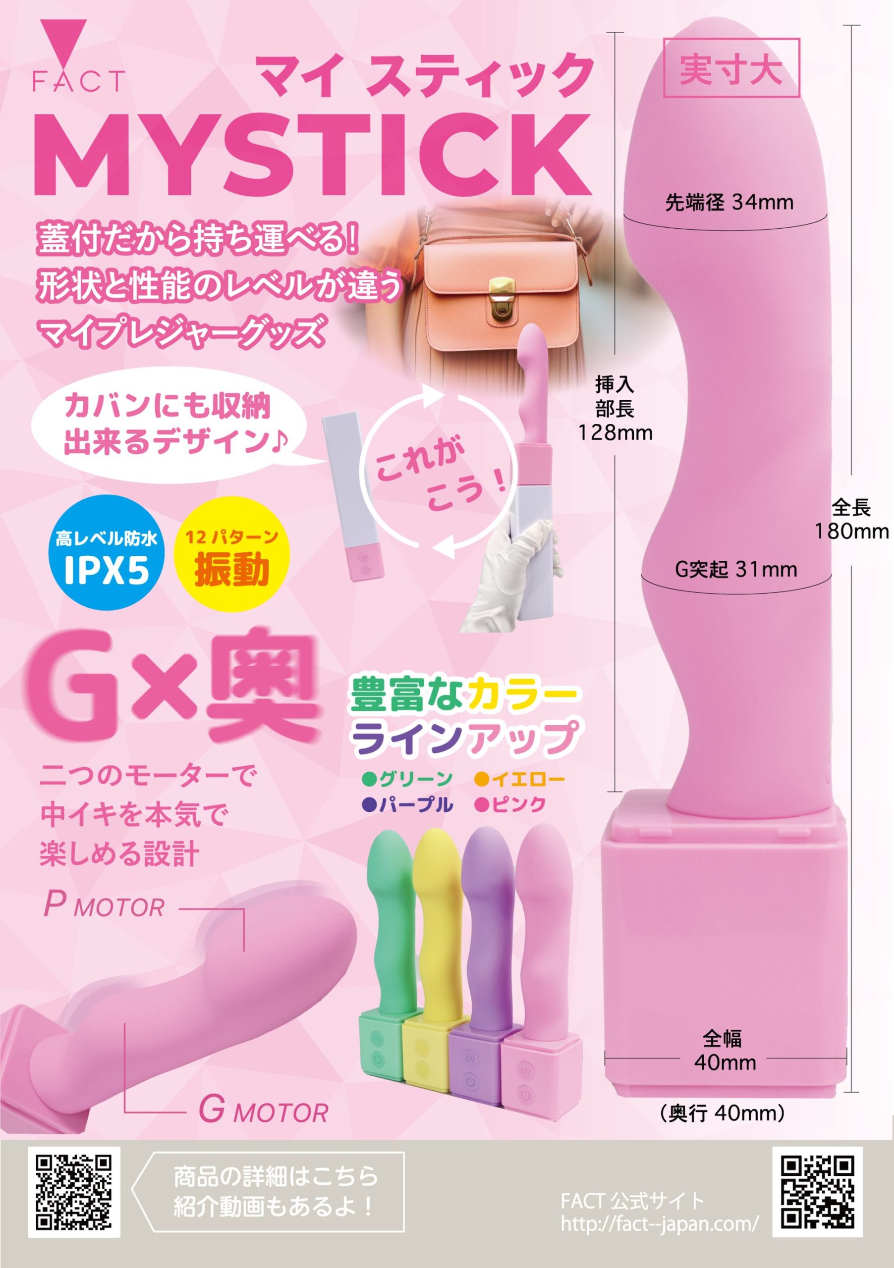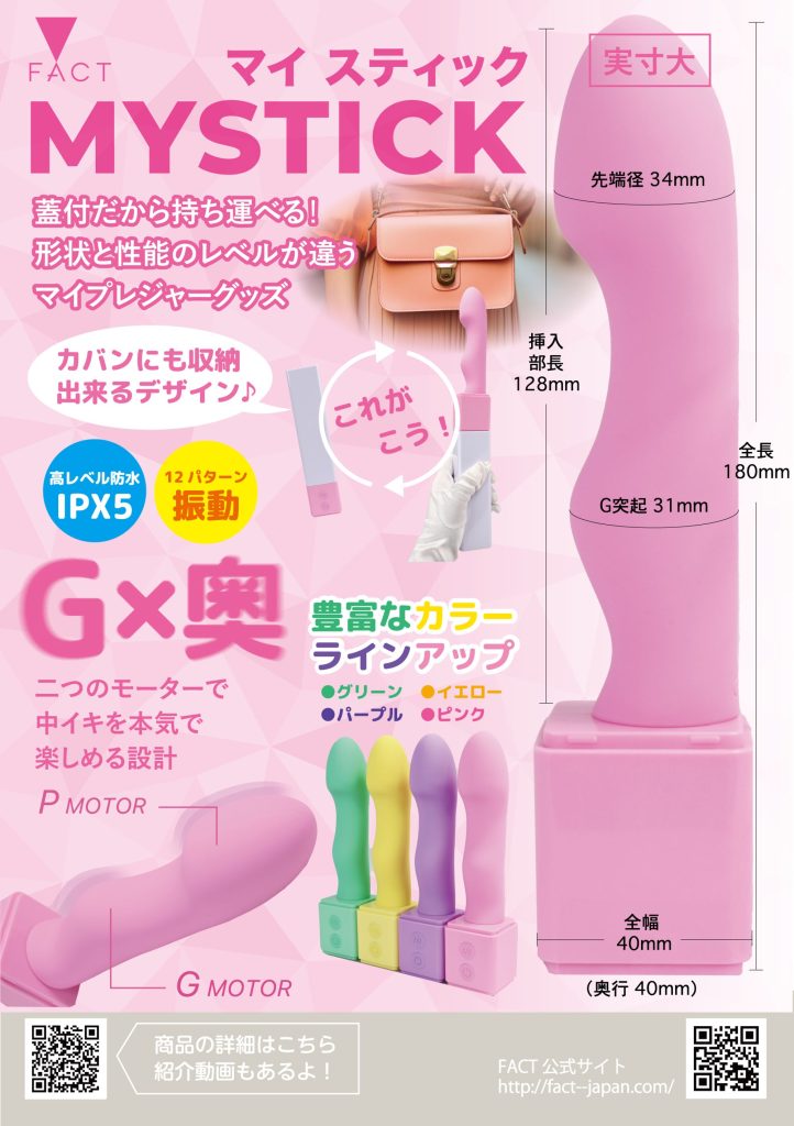コンパクトなサイズで、どこでも持ち運び可能です♪使用後はキャップを閉じるだけで、スマートに収納!日本人の体に合わせた128mmのスティック部分には、先端とG部分にそれぞれ高性能な振動モーターを搭載。